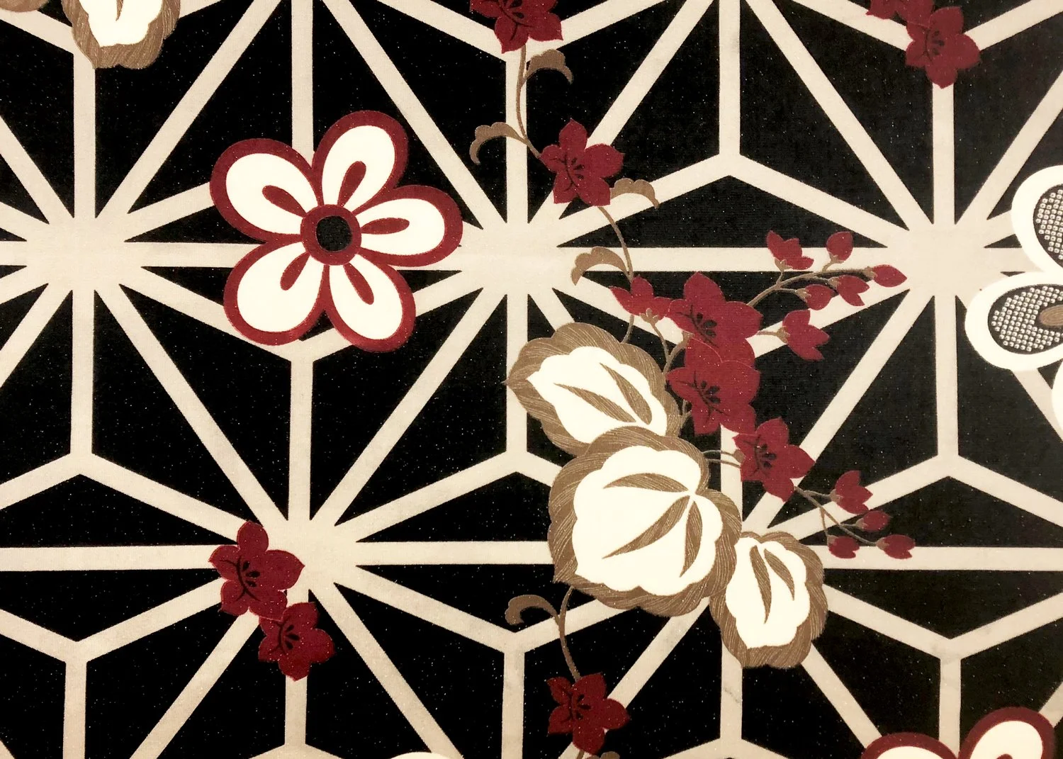 In this pattern, large Asanoha forms create a bold base, upon which equally striking plum blossoms and paulownia motifs are arranged. The generous scale and confident composition give the design a powerful presence. Its vivid colors and dynamic layout reflect a time when kimono designs became increasingly expressive and decorative.