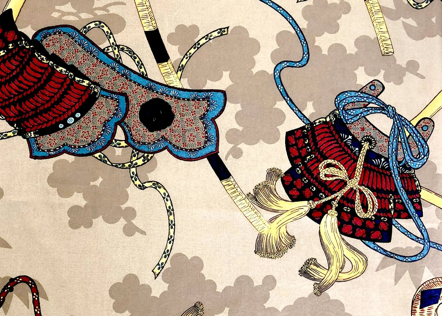 This pattern originates from a men’s undergarment of the Taishō period and depicts elements of a magnificent suit of samurai armor.