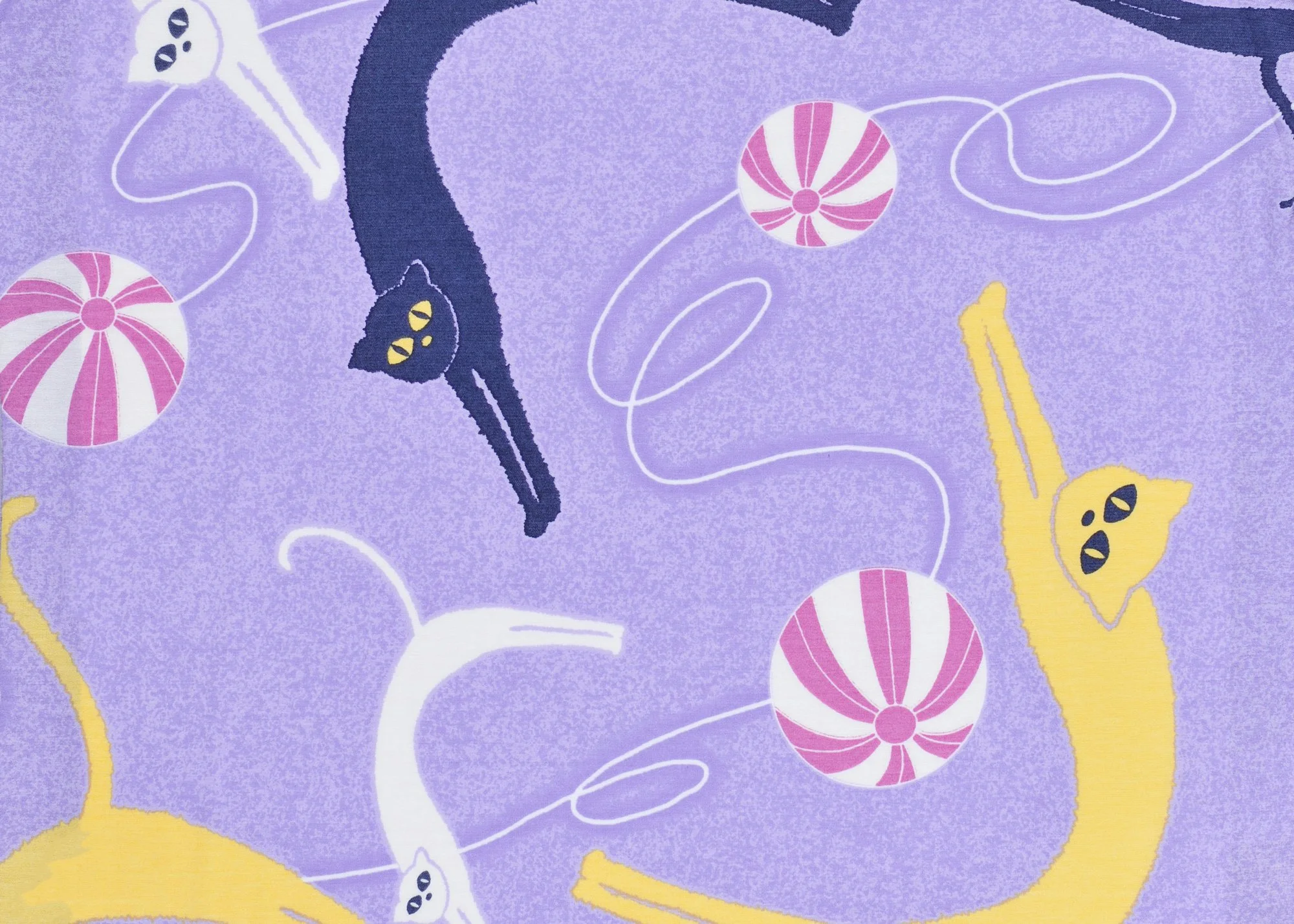 When depicted as a motif, cats are often paired with round objects—such as balls, bells, or yarn—playfully interacting with them. In this design, the cat is combined with a paper balloon. Rendered in a rhythmic, modern style reminiscent of the Taishō and Shōwa eras, the pattern vividly captures the endearing and lively spirit of cats, long beloved as companions close to everyday life.