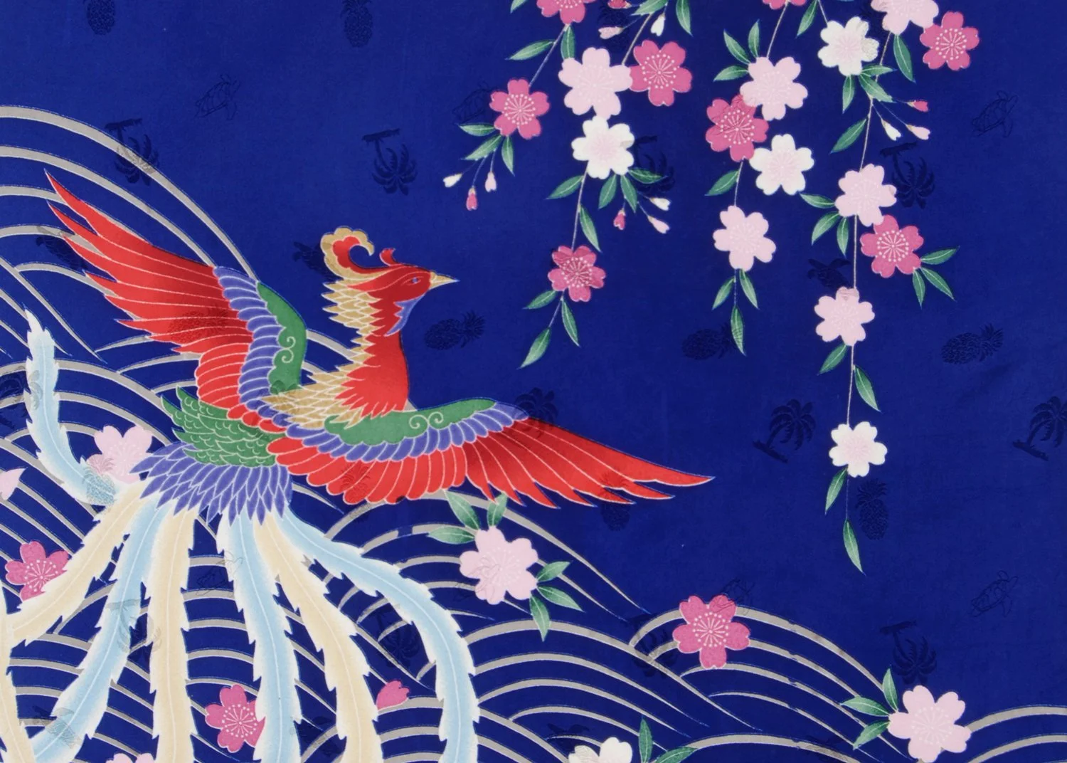 This pattern brings together cherry blossoms and the phoenix in a rare and refined composition. While uncommon in traditional designs, such motifs were associated with courtly elegance and were even used in garments connected to the imperial household during the Edo period. Together, the cherry blossom and phoenix create an auspicious design symbolizing beauty, renewal, and noble harmony.