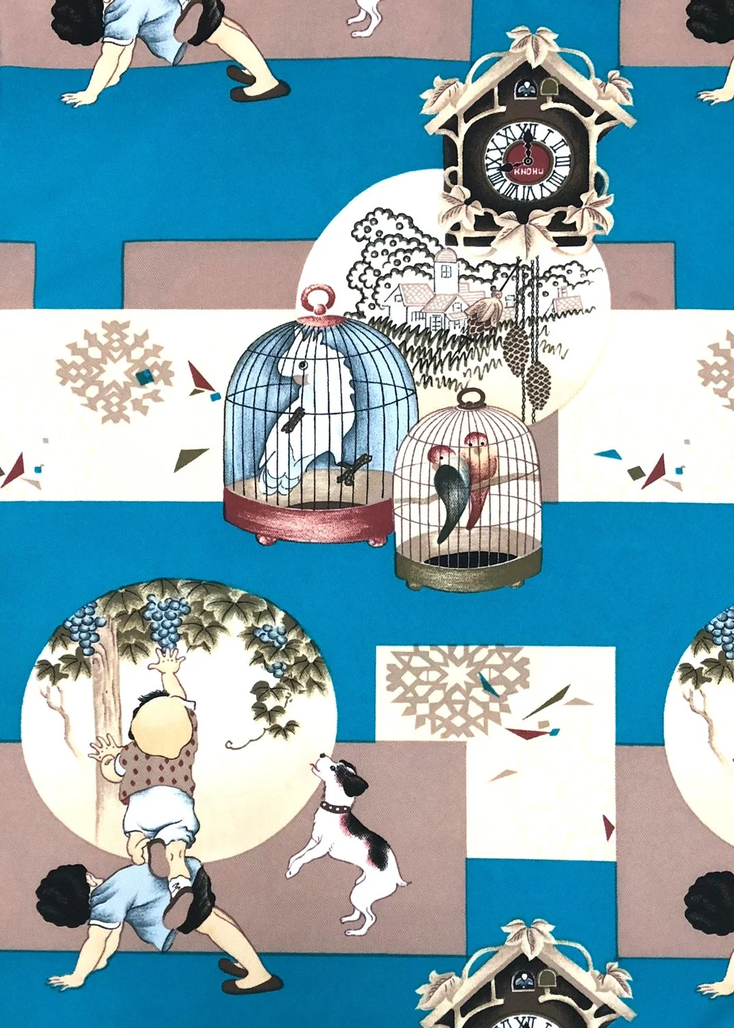 This pattern incorporates Western-style motifs, creating a whimsical and storybook-like impression. Parrots, parakeets, cuckoo clocks, Western dogs, and scenes reminiscent of European fairy tales—these elements served as a form of cultural and emotional education, introducing children to ideas from abroad in a playful and imaginative way.