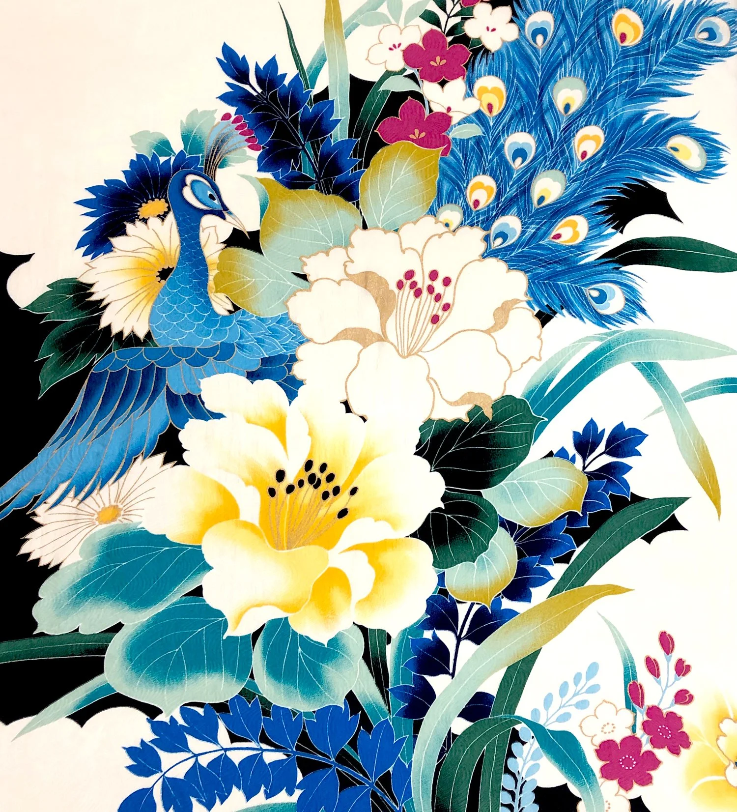 While both the sāla tree and the peacock are deeply connected to Buddhist symbolism, this pattern—created by a Shōwa-era designer—presents a serene and beautiful world through the combination of birds and flowers. Beneath its elegant surface, however, lies a rich layer of meaning.
