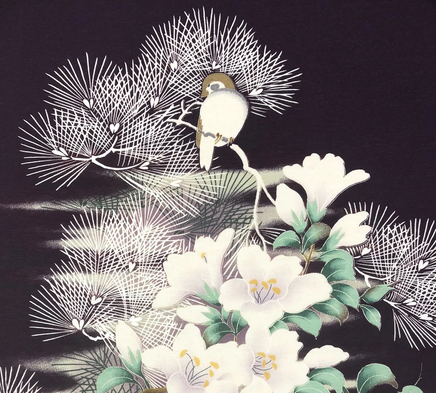 The sparrow in this design perches on a pine tree—one of the most symbolic auspicious motifs in Japan. As an evergreen (tokiwagi), the pine retains its green needles throughout winter, enduring wind and snow without losing its vitality. For this reason, it has long been associated with longevity and steadfast strength.