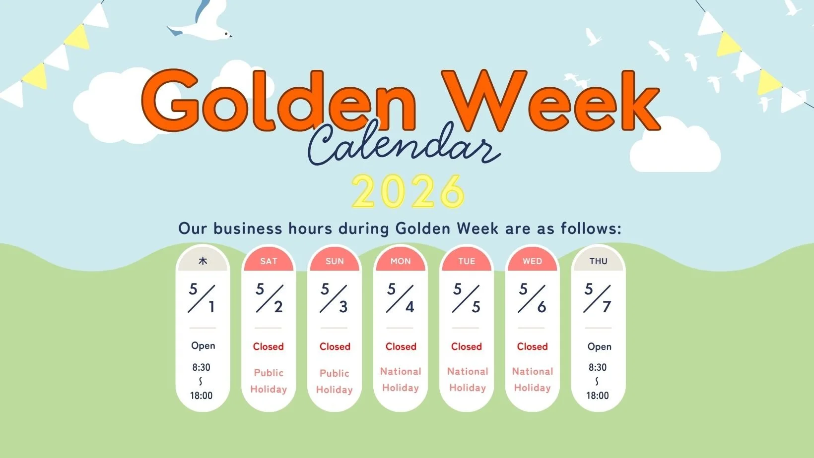 "Thank you for shopping with us. Please note our modified schedule during the upcoming Japanese Golden Week holidays."