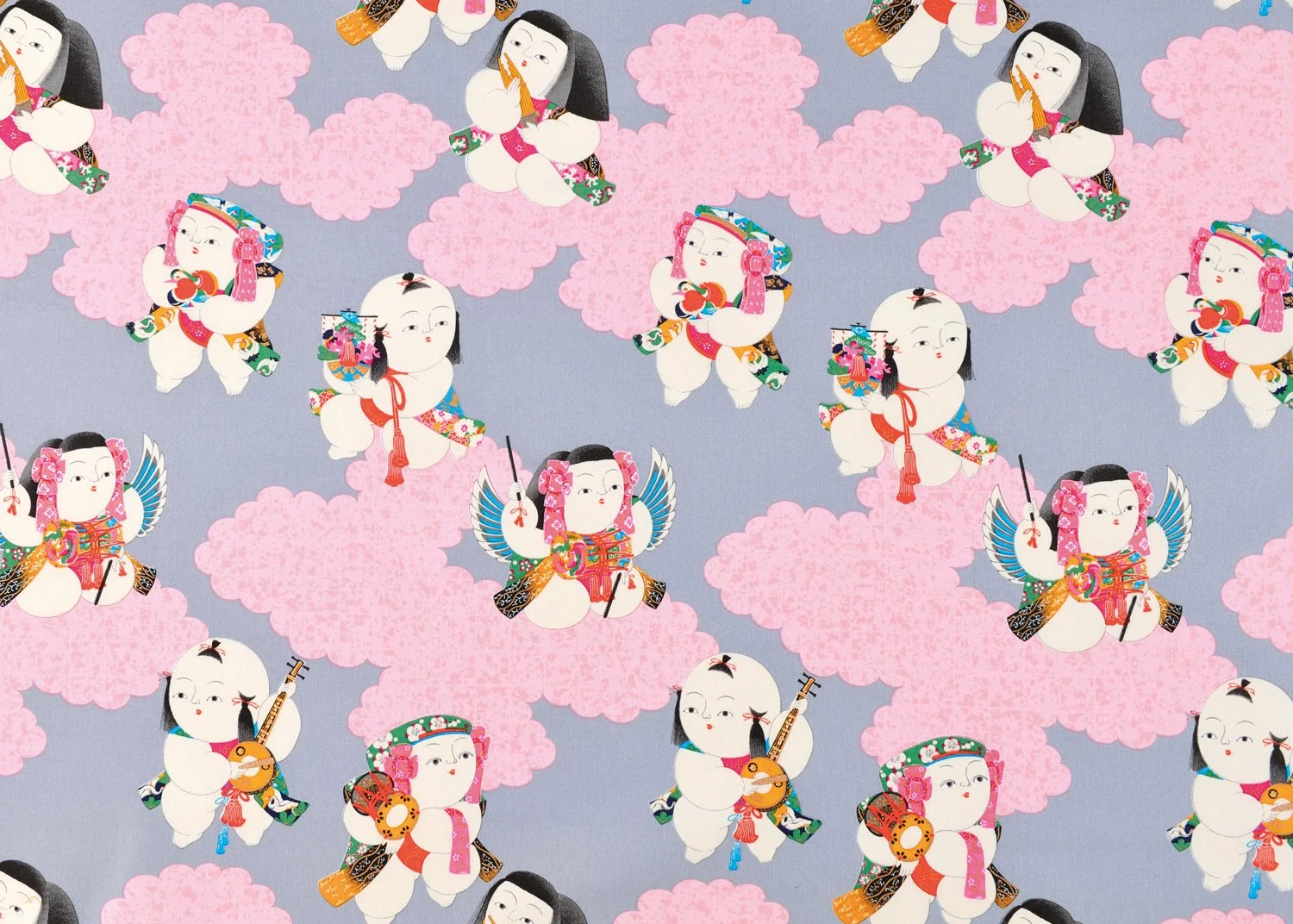 This pattern was used in the early Shōwa period for children’s kimonos and as lining for women’s haori jackets. It features charming court dolls engaged in gagaku—the refined music of the imperial court. Their playful and endearing expressions bring a sense of warmth and delight, reflecting the exceptional skill and sensitivity of designers of that era.