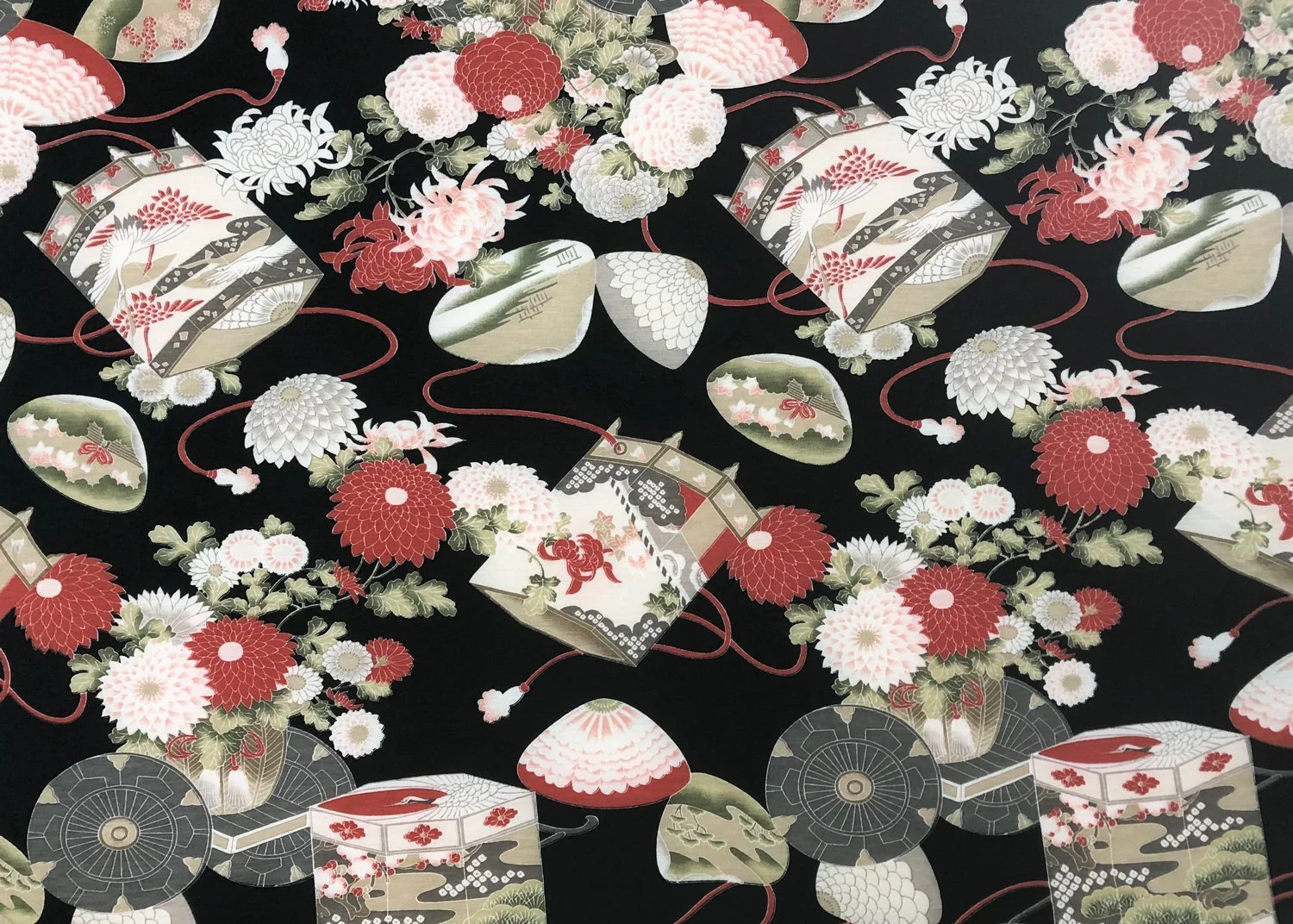 The “Shell Box and Flower Cart” pattern is a refined design inspired by motifs popular in the late 19th century, a time when yuzen dyeing flourished with new techniques and vivid color expression. Rich tones such as deep reds and purples, combined with detailed, painterly elements, give the pattern a sense of elegance and visual depth.