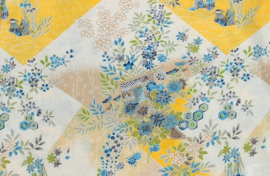 Its most distinctive feature is the background, which appears divided into patchwork-like sections. This composition, known as kiredori, brings together different fragments into a single unified design. Each section feels like a small window into a different motif, creating visual variety while maintaining overall harmony.