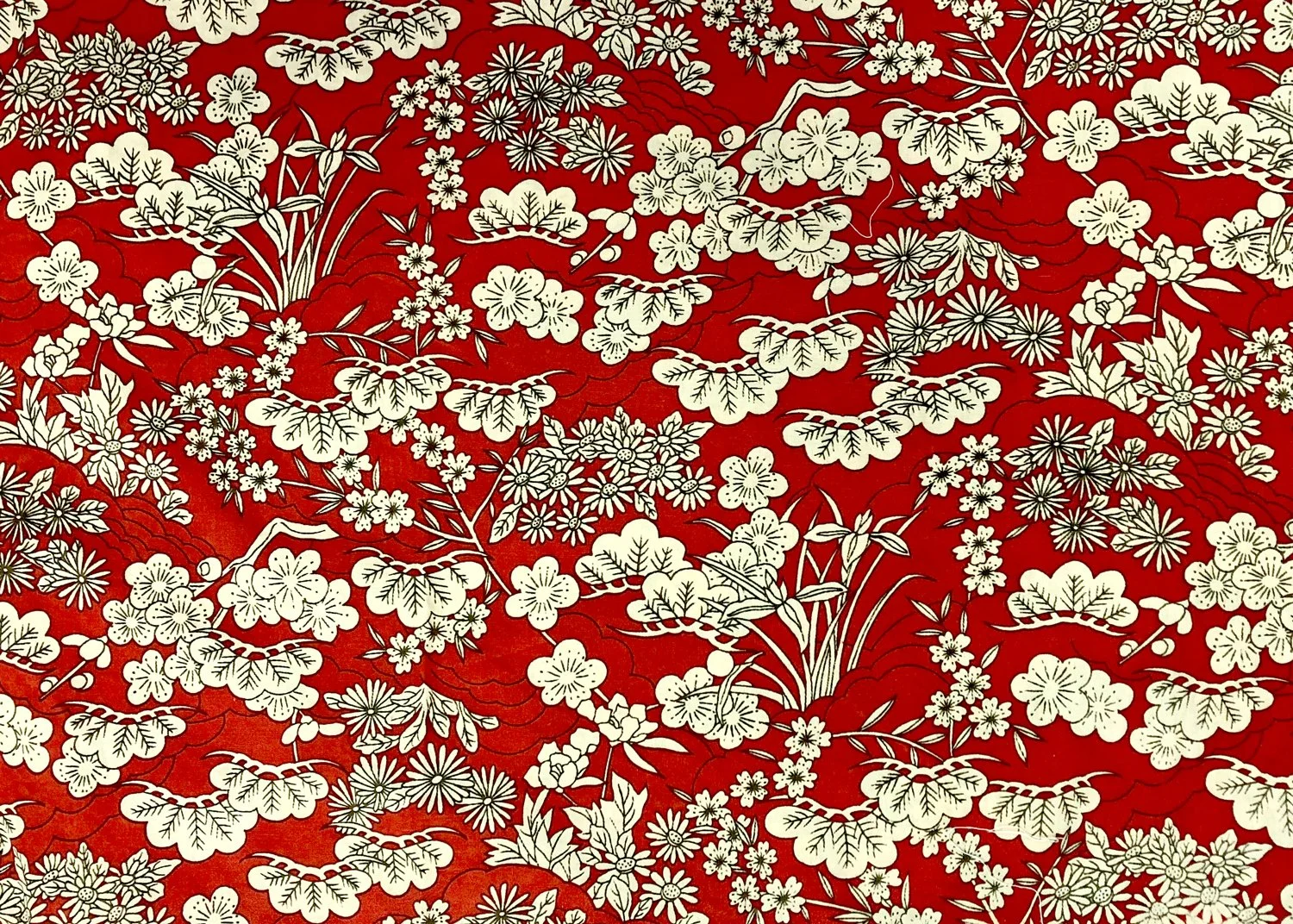 This pattern is a new creation—an adaptation of a classic design. It features a collection of auspicious flowers—pine, bamboo, plum, cherry blossom, chrysanthemum, peony, and iris—rendered delicately in outline. The result evokes the elegant patterns once seen on the garments of court ladies during the Edo period.