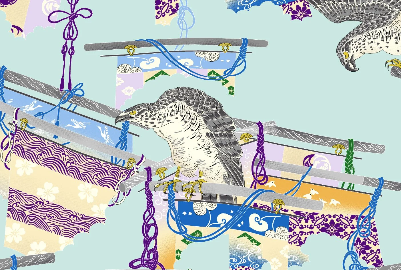 Hawks are a common motif in boys' baby clothes and are frequently seen in Shichigosan kimonos even today. These ferocious birds are known for their impressive sharp beaks and claws, as well as their keen eyesight, which allows them to spot and capture prey from great distances. Historically, feudal lords admired and favored hawks for their bravery.