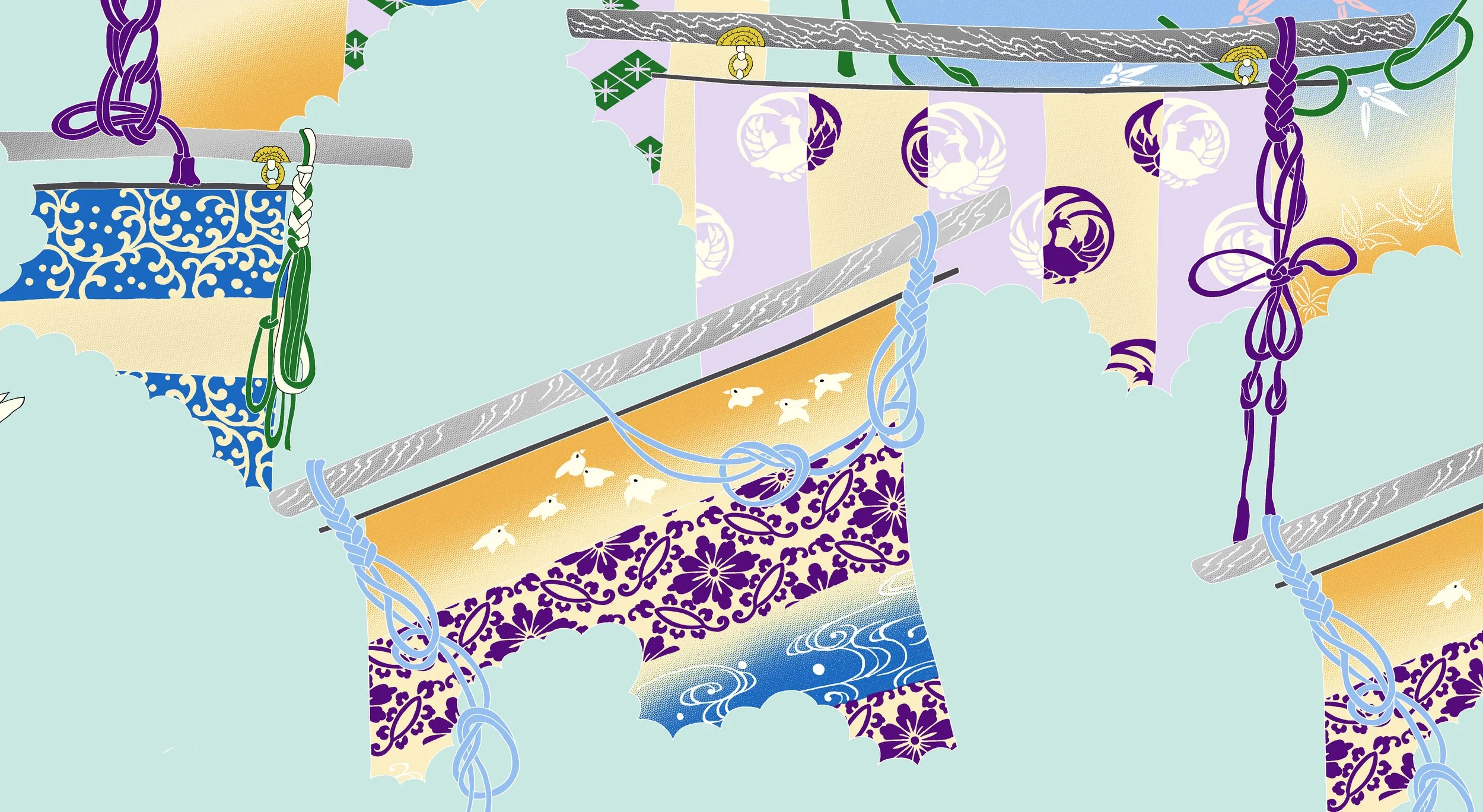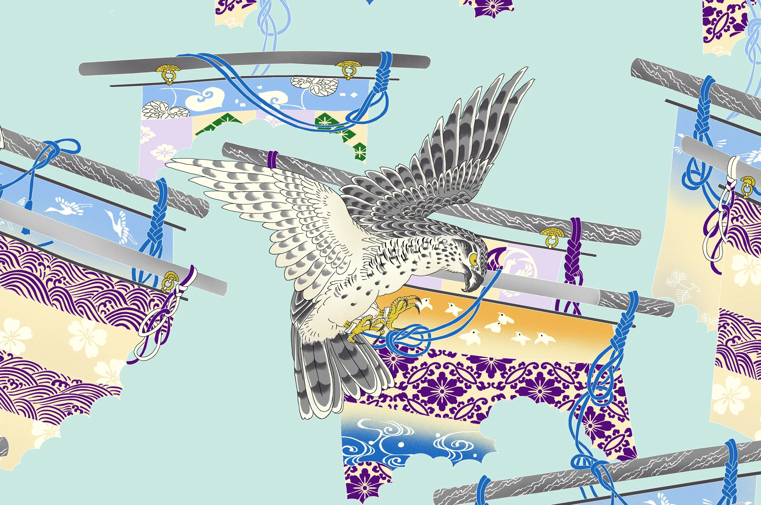 During the late Edo period, the hawk pattern became popular in kimono design and was often combined with other auspicious designs. Typically, this pattern includes a folding screen alongside a hawk. A folding screen is a piece of indoor furniture used as a partition, and pairing a hawk with a folding screen is a common artistic motif.