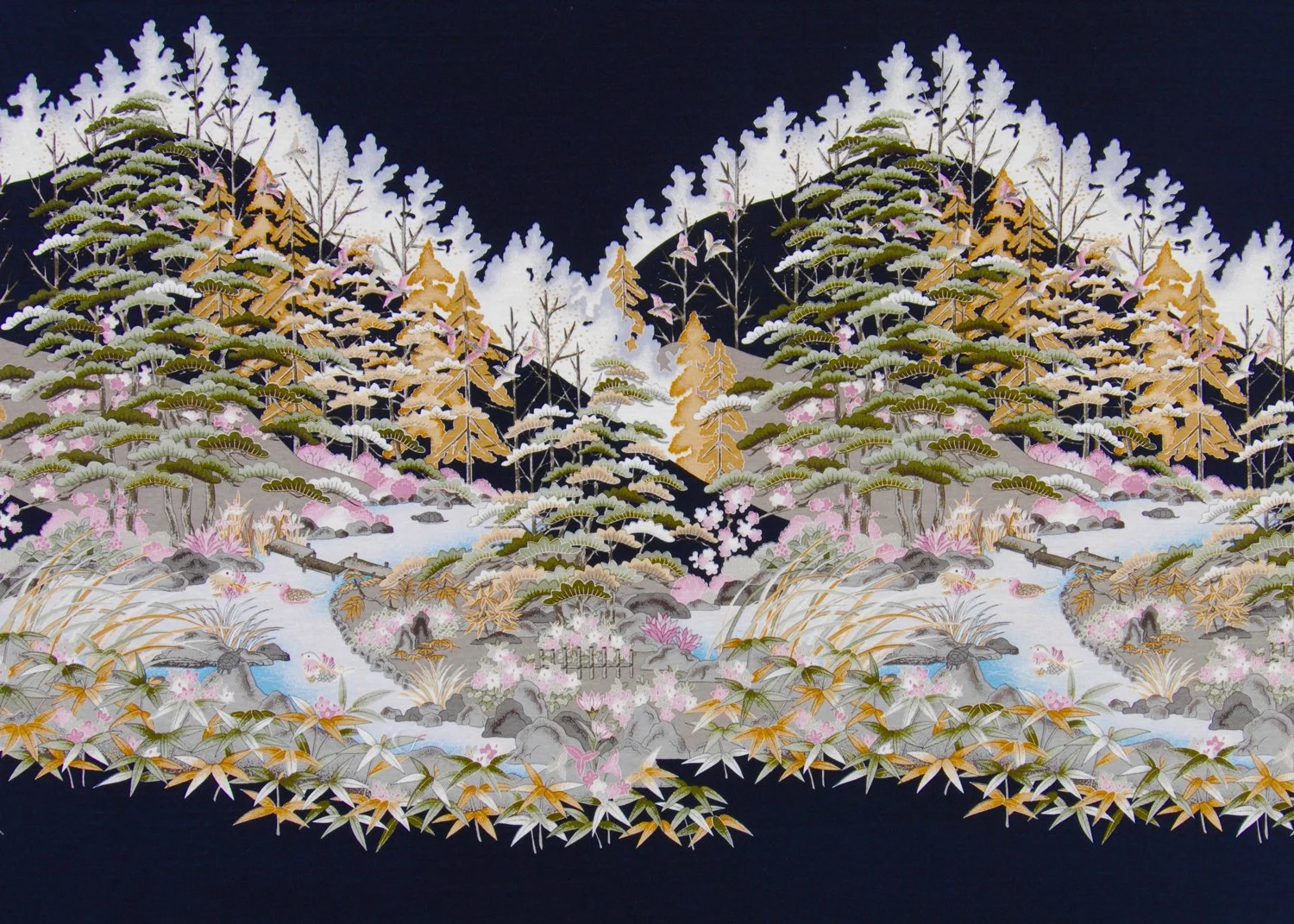 In the Kamakura and Muromachi periods, motifs began to incorporate themes from poetry and classical literature, giving rise to uta-e—designs in which imagery and poetic sensibility blend harmoniously. By the Edo period, landscape patterns often carried literary meaning; by recognizing the scene depicted on a kimono, one could sense the story or poetic reference behind it. Such designs also served as an expression of cultural refinement.