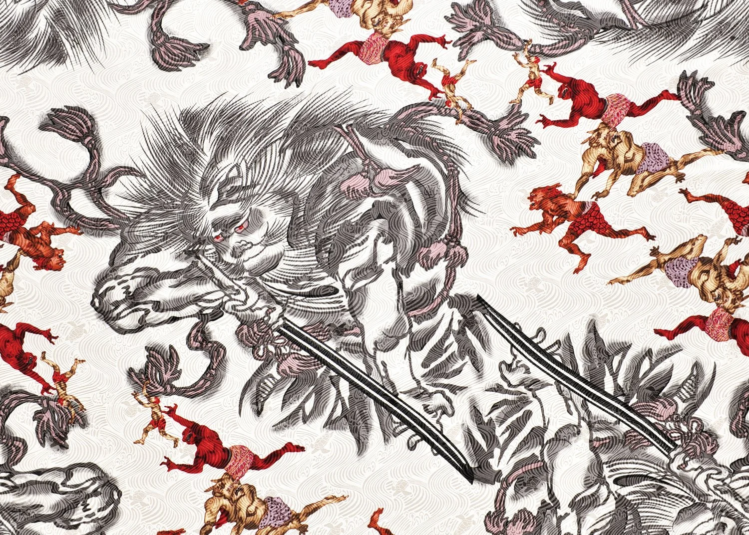 This design portrays demons being punished by other demons who serve Enma Daio. The original motif was used for the lining of men’s haori (short jackets) and dates back to the early Shōwa period.