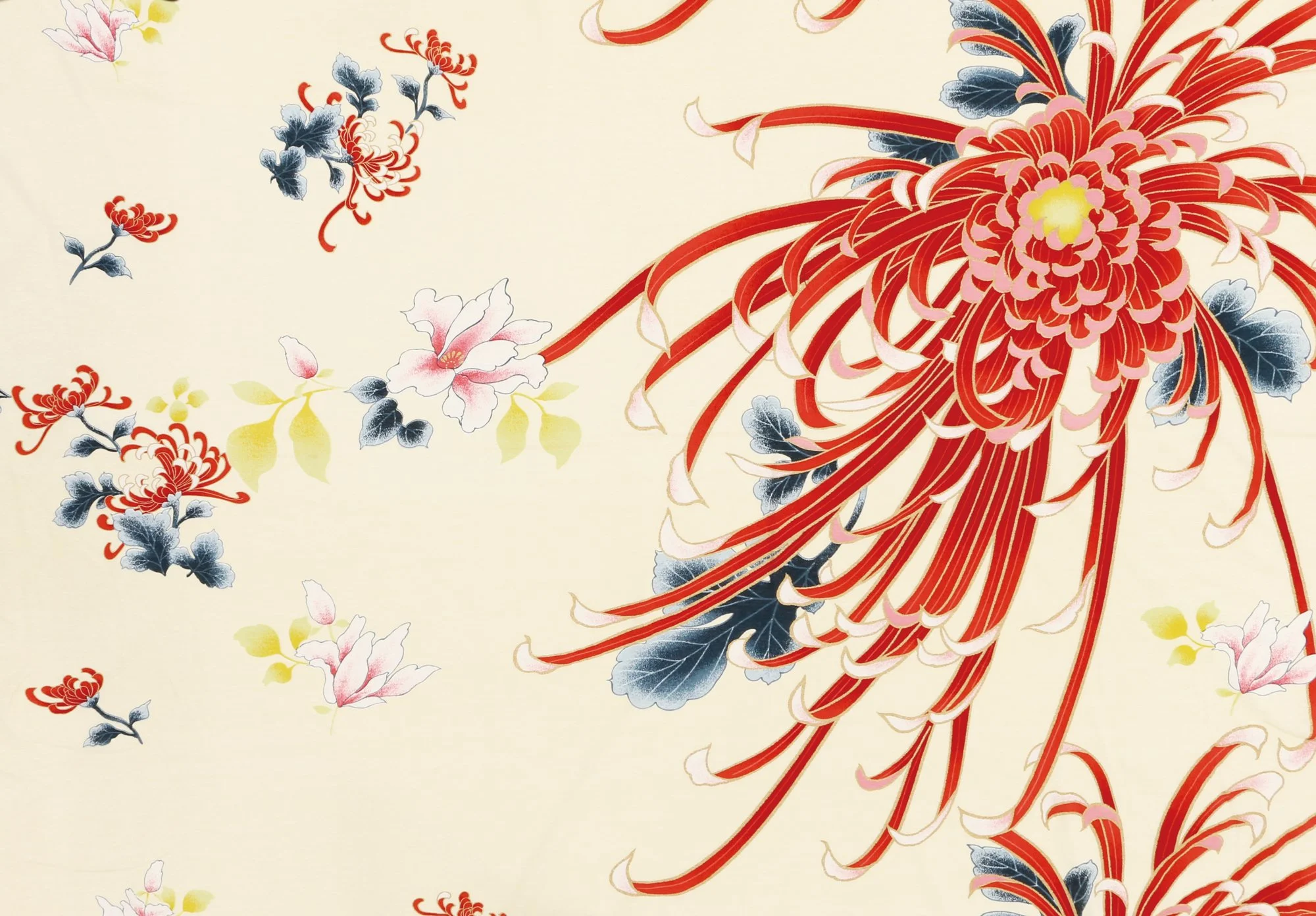 Among these, the slender-petaled chrysanthemums are particularly striking. Their long, delicate petals spread outward in fine lines, with their tips softly curling like threads. This pattern captures that dynamic movement, expressing both precision and softness in a bold, flowing form.