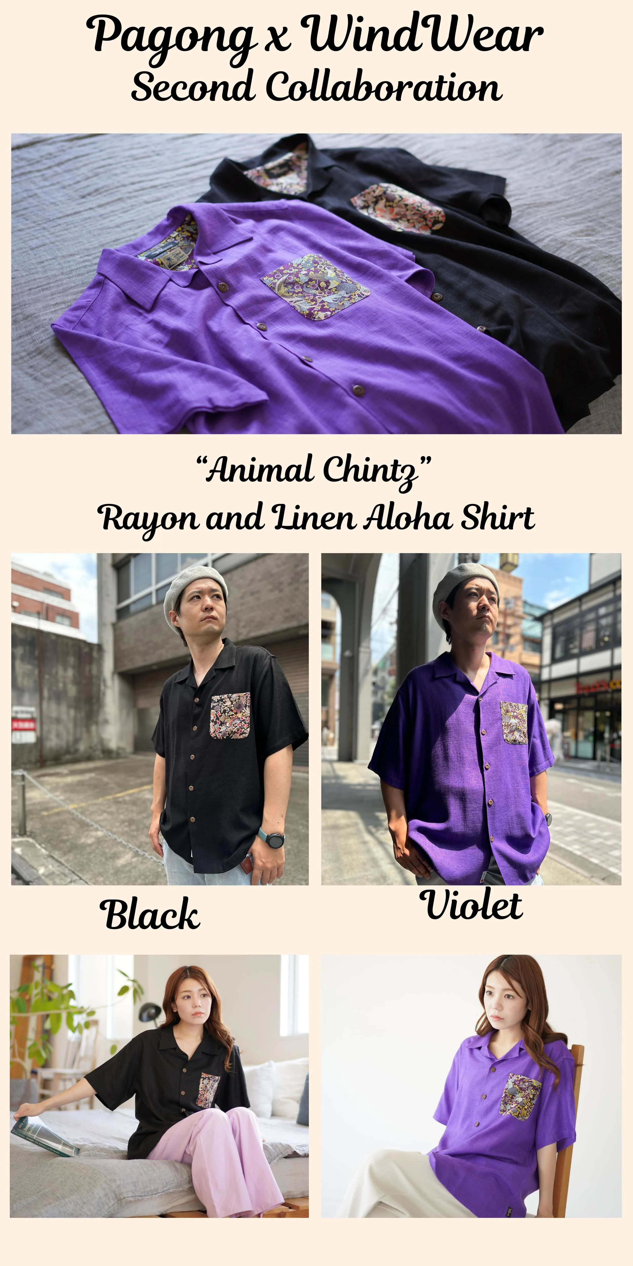 Our second collaboration features an aloha shirt with black and violet color combination where the inner shoulders and pockets have been silk fabric fitted with animal chintz pattern.