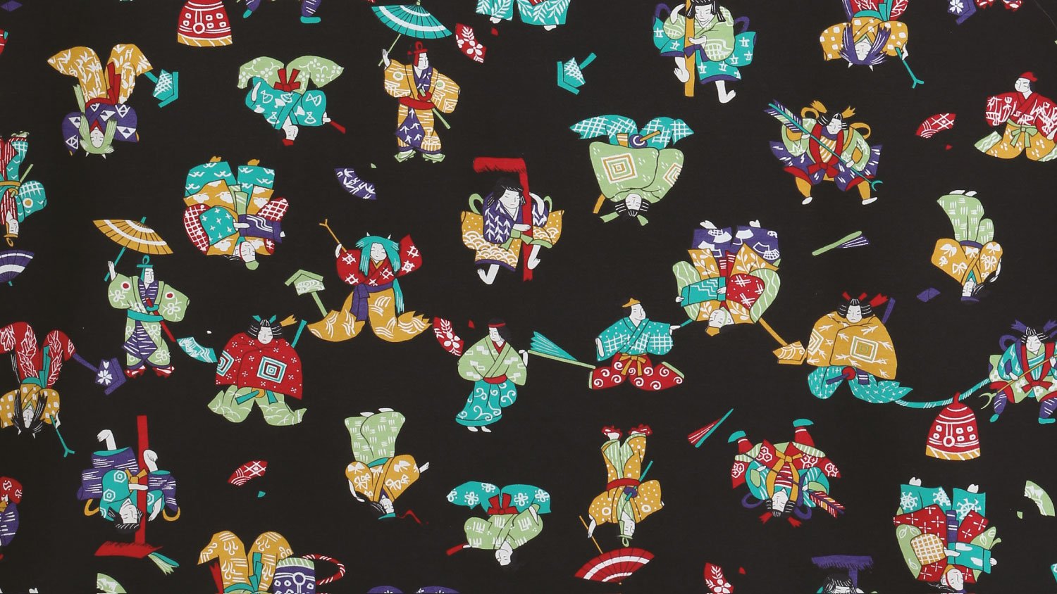 The visual style reflects the influence of aragoto theater, with its exaggerated forms and powerful presence. Strong lines and contrasting colors give the pattern a striking impact, while the arrangement across the fabric maintains harmony and flow.
