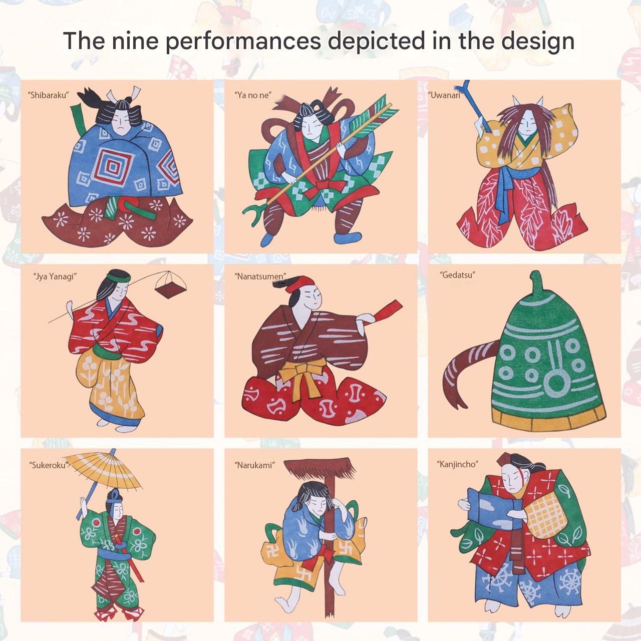 Across the design, symbols and figures from selected plays are arranged in a lively yet balanced composition. Bold shapes, expressive poses, and stylized props create a sense of movement, echoing the dramatic spirit of kabuki. Each motif stands out individually while contributing to an overall rhythm, much like scenes unfolding across a stage.
