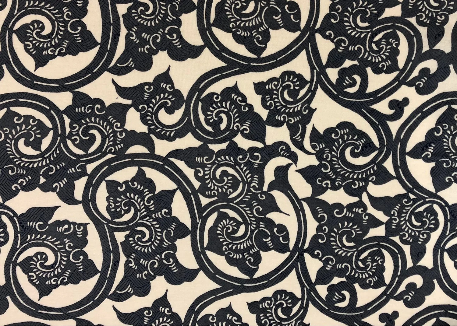 Arabesque, a flowing vine pattern, traces its origins to ancient civilizations such as Egypt, Mesopotamia, and Greece. It later spread eastward along the Silk Road, eventually reaching Japan. Though arabesque does not represent a specific plant, its spiraling, interwoven forms are inspired by climbing vines like grapes. Because of their strong vitality and endlessly extending growth, such patterns came to symbolize longevity and the flourishing of future generations.