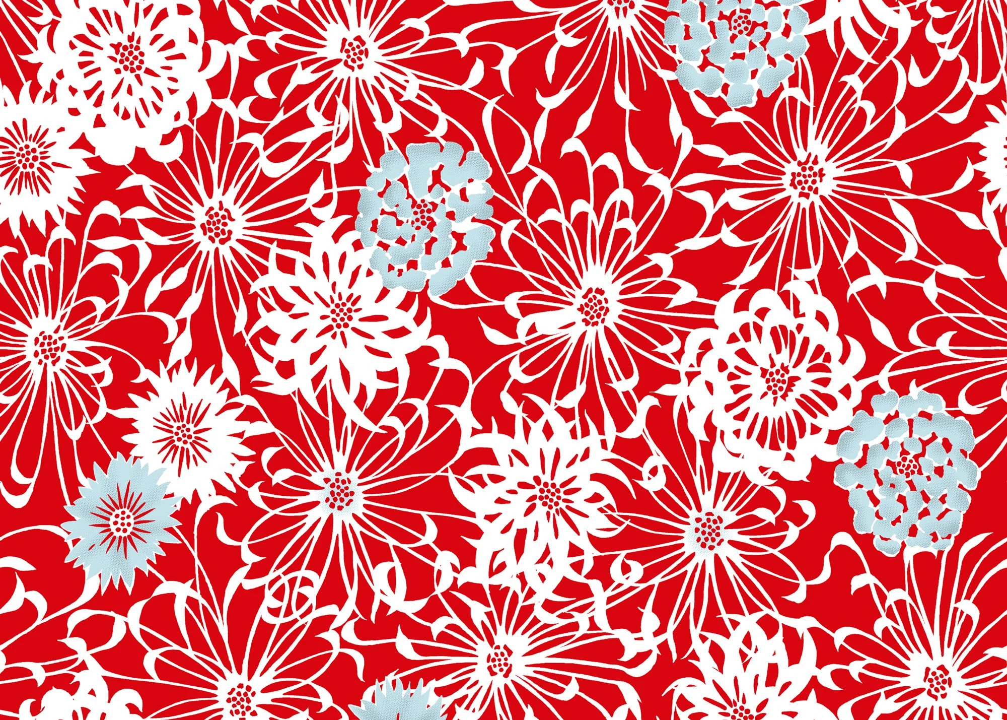 Rendered in simple, elegant colors, the pattern highlights chrysanthemums in diverse forms and shapes. These variations reflect the long history of cultivation and aesthetic appreciation in Japan, where chrysanthemums have been refined over generations into flowers of remarkable diversity and beauty.