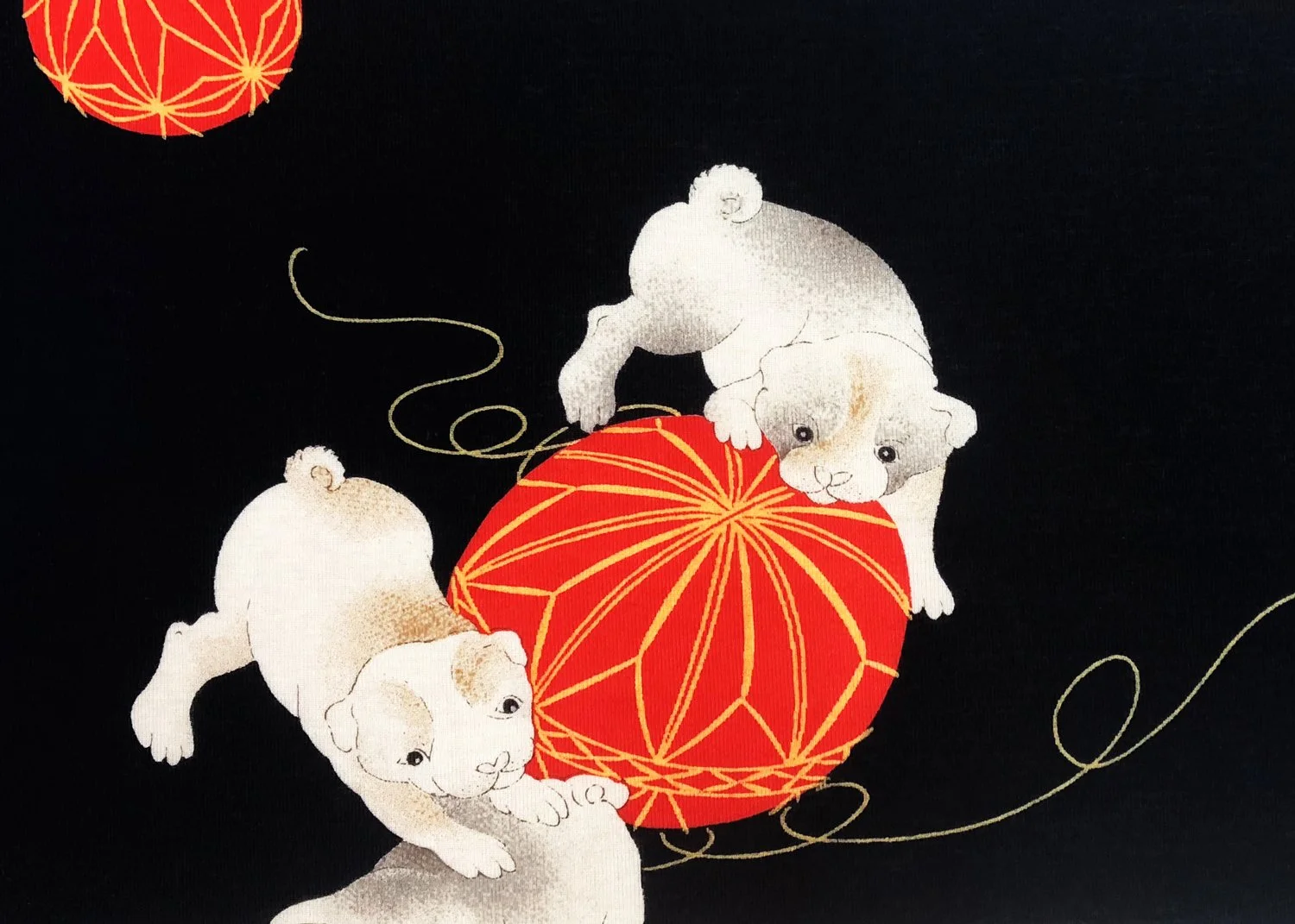 In this pattern, a small dog is shown playfully interacting with a temari, a traditional embroidered ball. The round form of the ball symbolizes completeness and harmony, while also representing good fortune and continuity. Together, the lively movement of the dog and the soft, balanced form of the ball create a composition full of life and gentle energy.