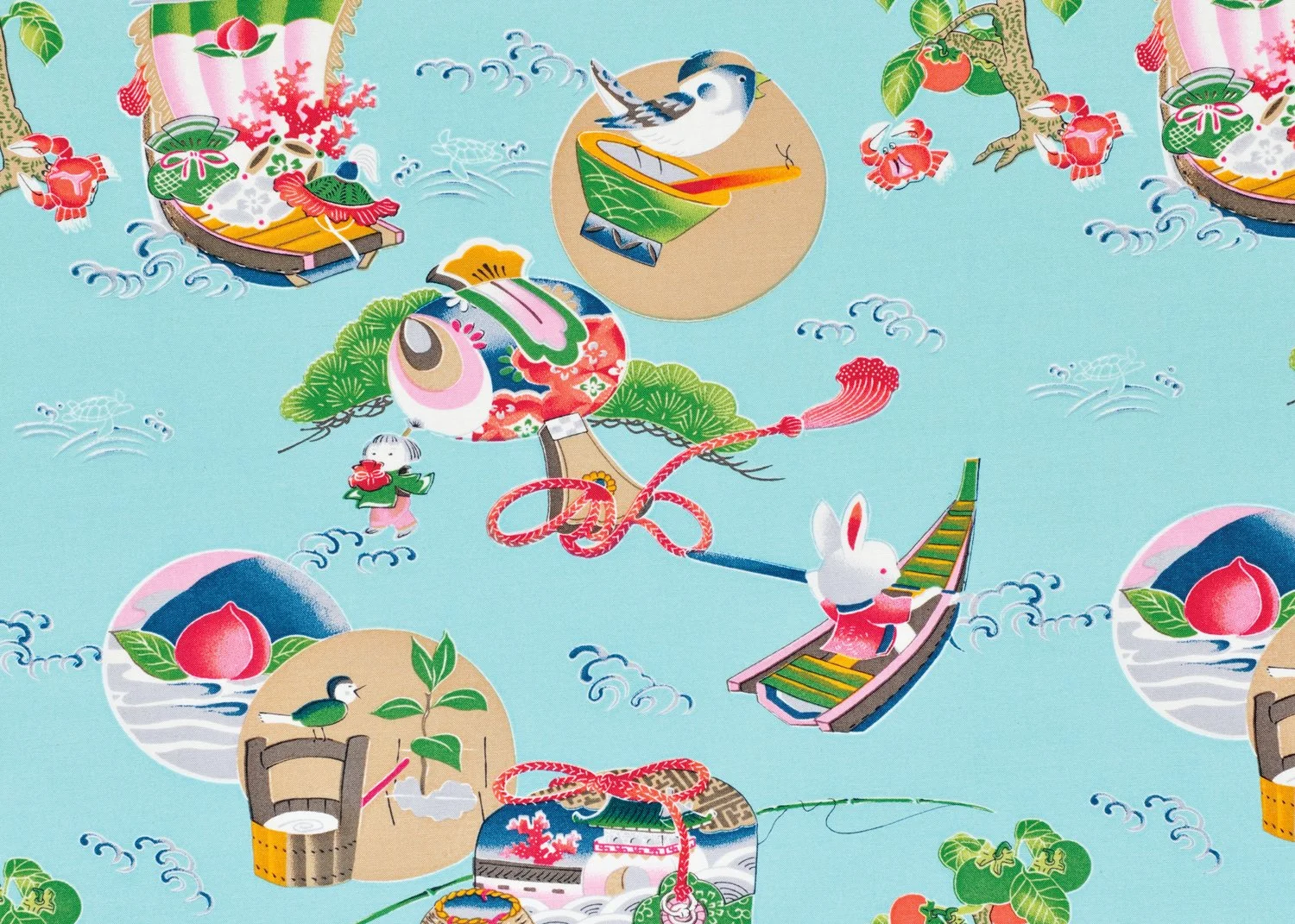 Figures and scenes are rendered in a cute, approachable style, transforming well-known tales into decorative elements that flow across the fabric. Characters from stories such as Momotaro, the Tongue-Cut Sparrow, Issun-boshi, Kachi-Kachi Mountain, Urashima Taro, and The Monkey and the Crab appear as small, lively accents, arranged in a way that feels both dynamic and harmonious.