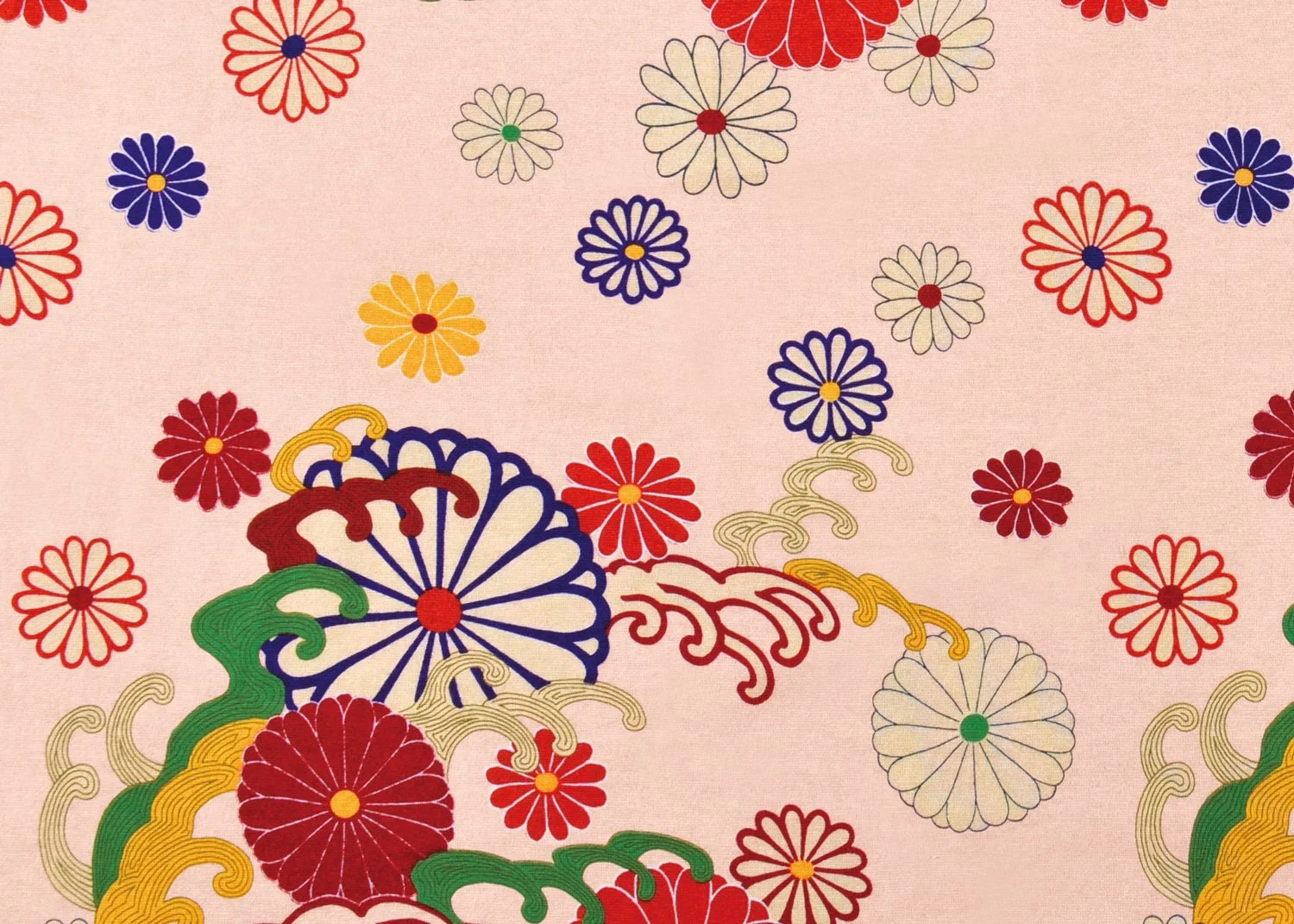 This is a simple yet graceful pattern composed of chrysanthemums and flowing waves. Often paired with water motifs, chrysanthemums are here expressed through rhythmic waves, creating a design that feels both calm and continuous.