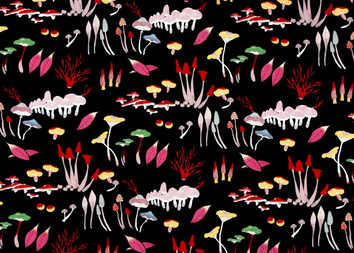 The mushrooms are depicted in a graphic, almost illustrative style, reminiscent of designs found in printed works. Rather than pursuing naturalistic detail, the pattern emphasizes form and silhouette, highlighting the unique and sometimes unexpected shapes of each mushroom. This stylization gives the design a modern, slightly playful character.
