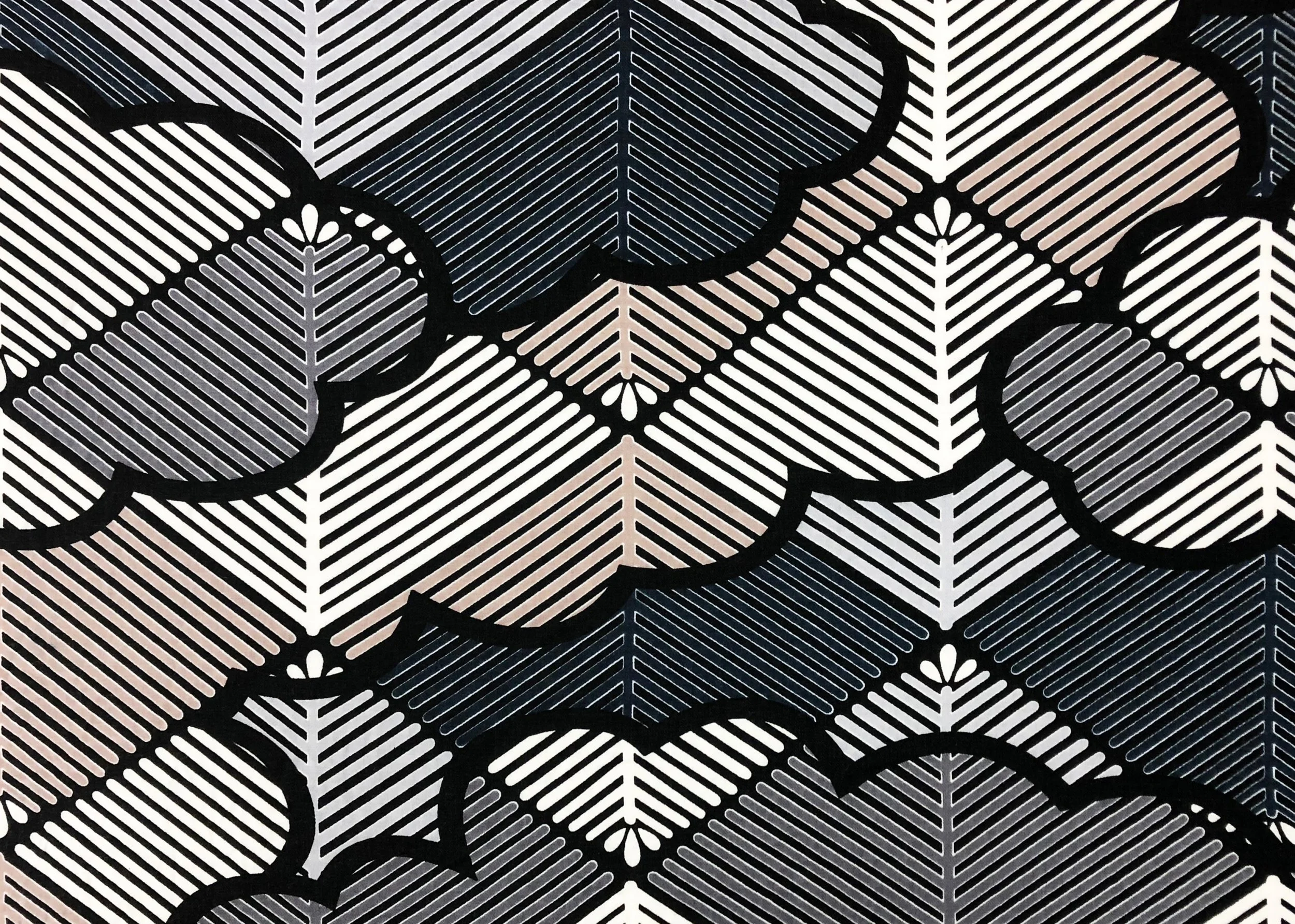 Layered above this structured base are soft cloud motifs, expressed through gentle, flowing arcs. These clouds introduce movement and contrast, softening the straight lines of the pine design while adding depth and atmosphere.