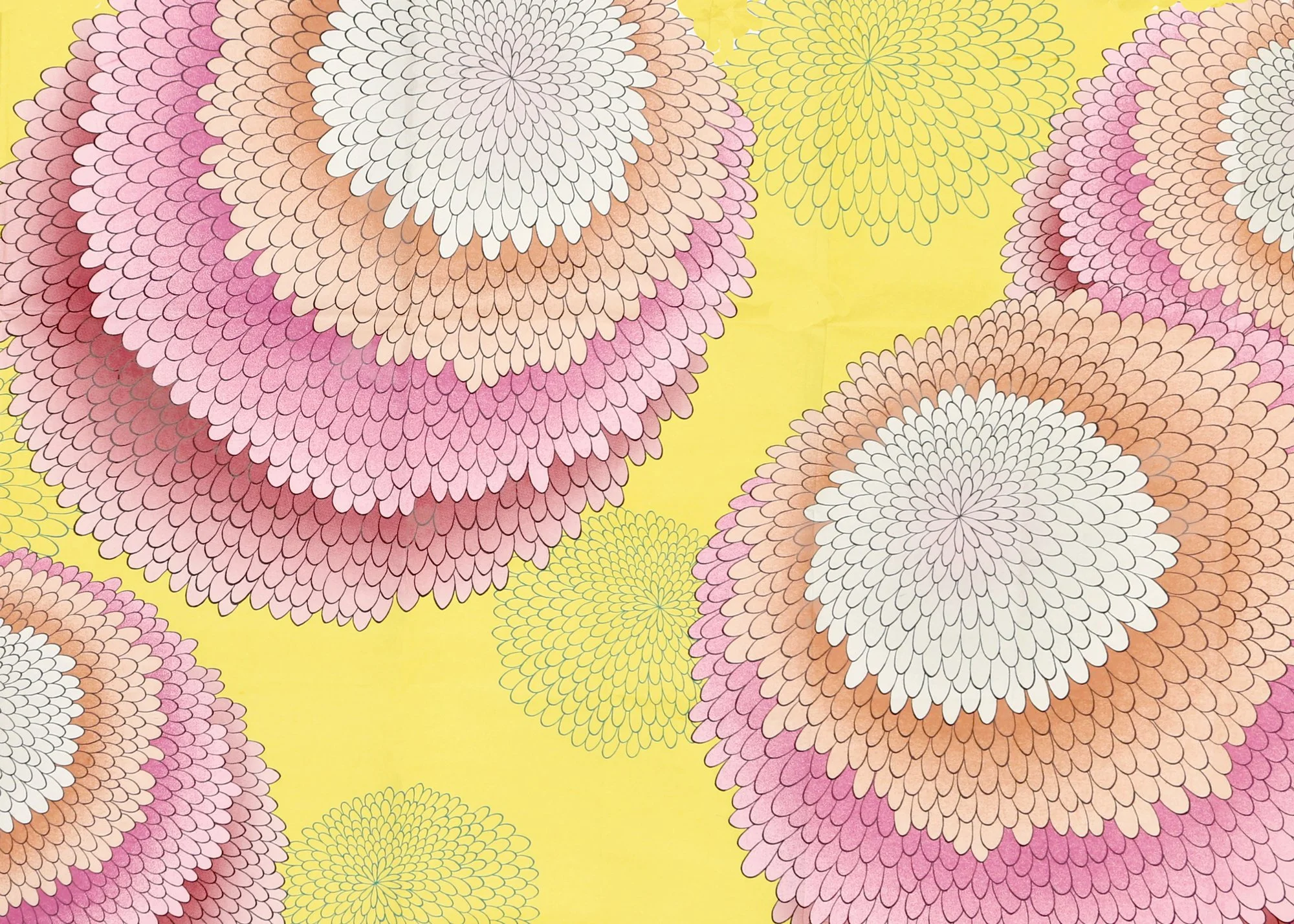 The voluminous, spherical chrysanthemums in this design express harmony and auspiciousness through their fullness and presence. By incorporating the rounded form of Western-style chrysanthemums and boldly stylizing them, the design gives a modern reinterpretation to a traditional motif.