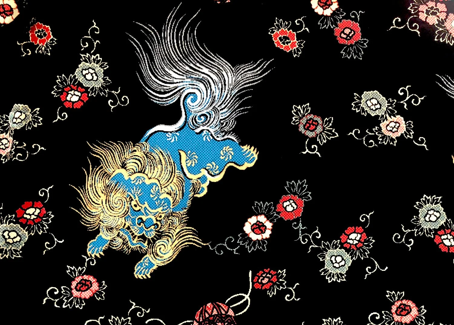 There is also a well-known legend that lions test their cubs by casting them into a deep ravine, raising only those strong enough to climb back. Inspired by this idea, Kabuki performances such as Renjishi and Kagamijishi were developed from Shakkyo. The dramatic costumes seen in these dances—featuring flowing manes and fan-shaped headpieces adorned with peony motifs—eventually became iconic visual elements reflected in this design.