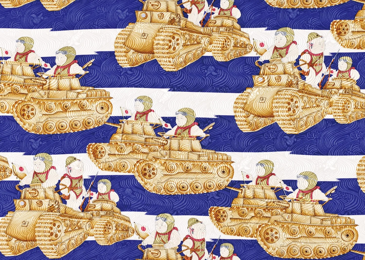 This early Shōwa design portrays a tank advancing forward with a child riding inside it. Alongside airplanes and naval vessels commonly seen in wartime motifs, tanks were depicted as exciting vehicles that captured children’s imaginations. The child is represented as a Gosho Ningyō—a doll symbolizing the ideal child. With its round form representing abundance and good fortune, the Gosho Ningyō traditionally embodies innocence and prosperity.